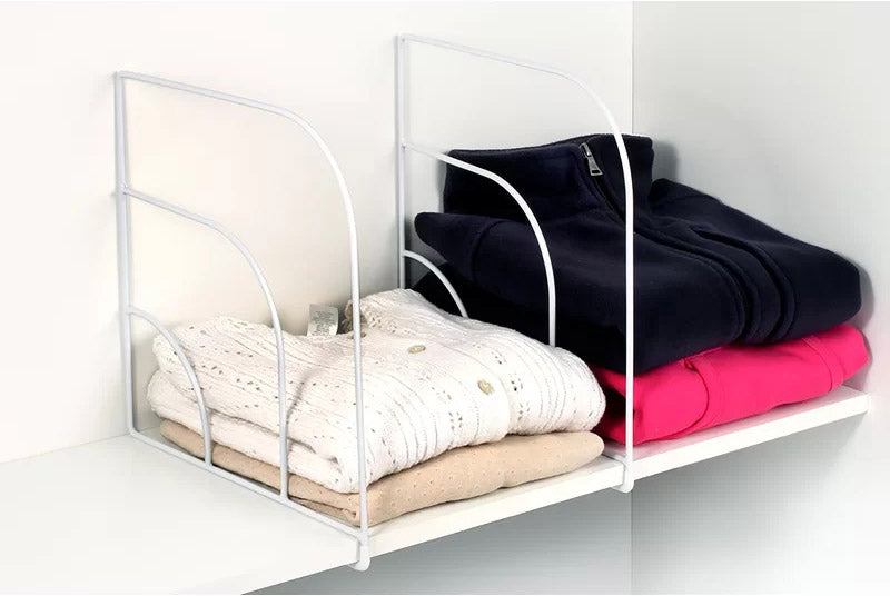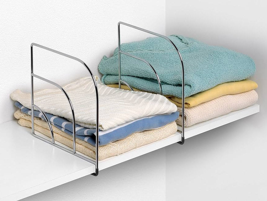 Create more efficient storage shelves by keeping item organized and separated with a pair of curved Wire Shelf Dividers. Available in either a white or polished chrome finish. these closet shelf dividers fit neatly on .75 inch thick shelves. and stand almost a full foot tall to organize linens. clothing. books and much more.