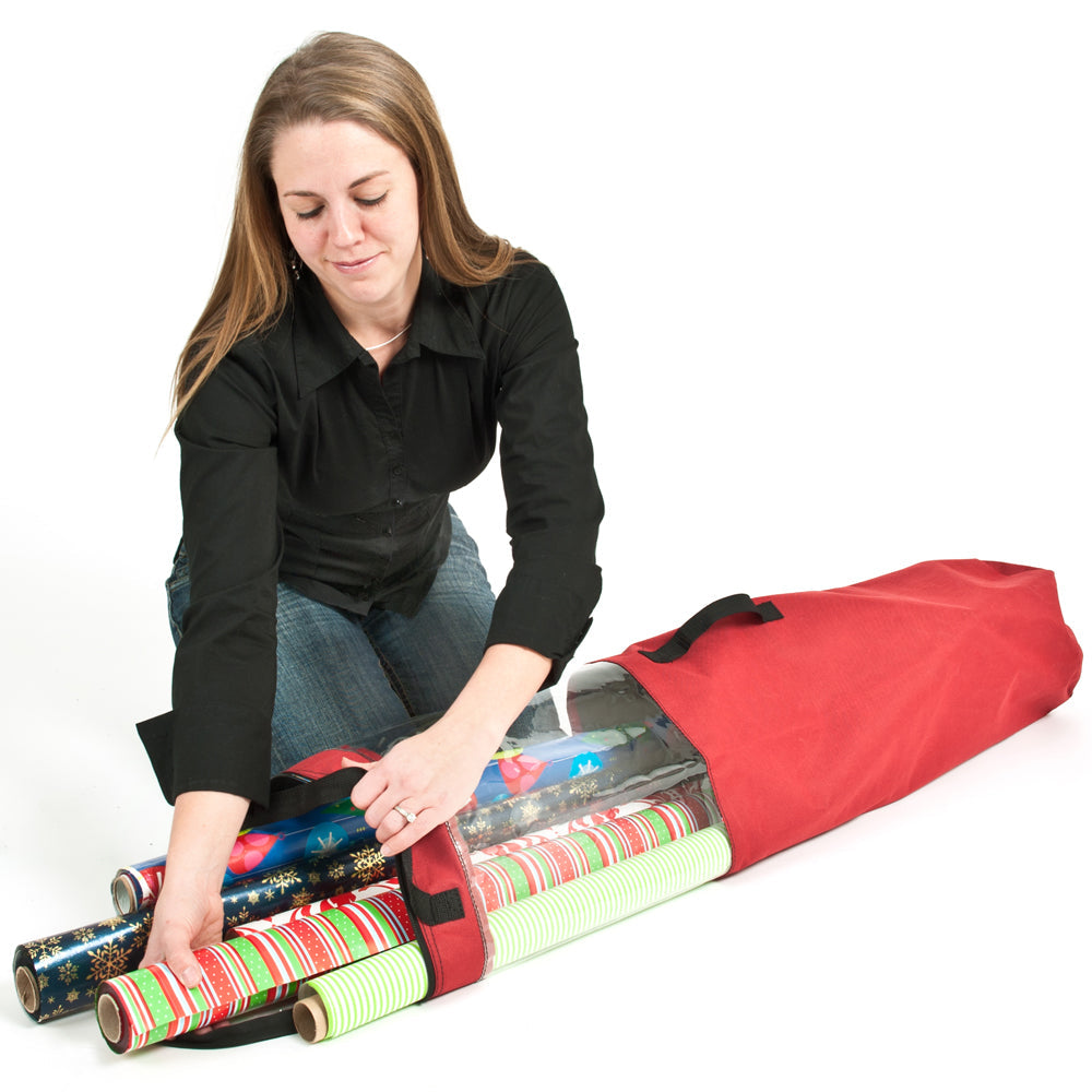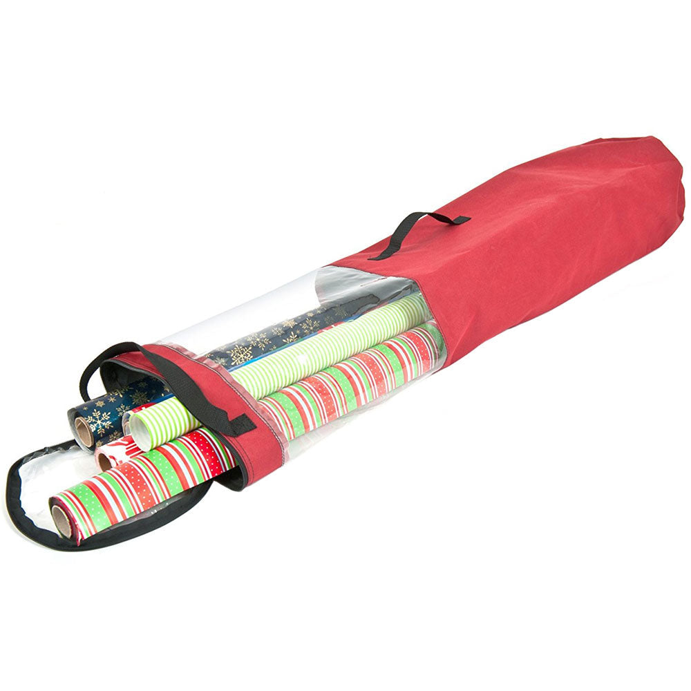 This Wrapping Paper Storage Bag is designed to keep your gift wrap neatly stored and protected between holiday seasons. Capable of holding wrapping paper up to 40 inches long. this gift wrap storage bag also features a clear window to let you see the rolls that are stored within. The bag comes in a bright red color to get you in the holiday spirit. A side and top carrying handles makes it easy to transport to your gift wrapping station.